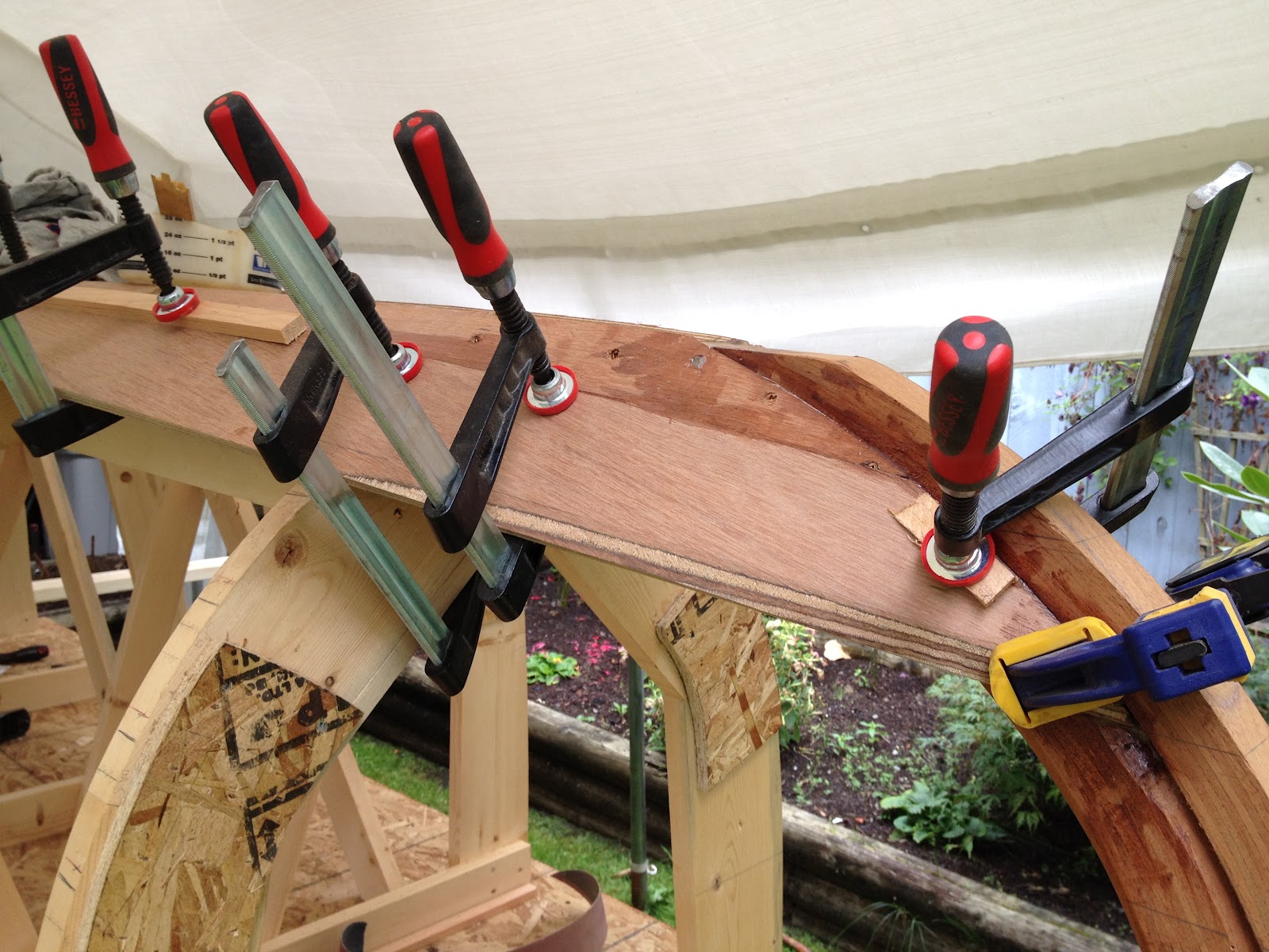 I work and continue to discover new tricks and helpful techniques. The shaping and fastening process is not one that I can speed up. Rather I've settled into a pace that allows me to install 1 plank per day. It goes something like this: